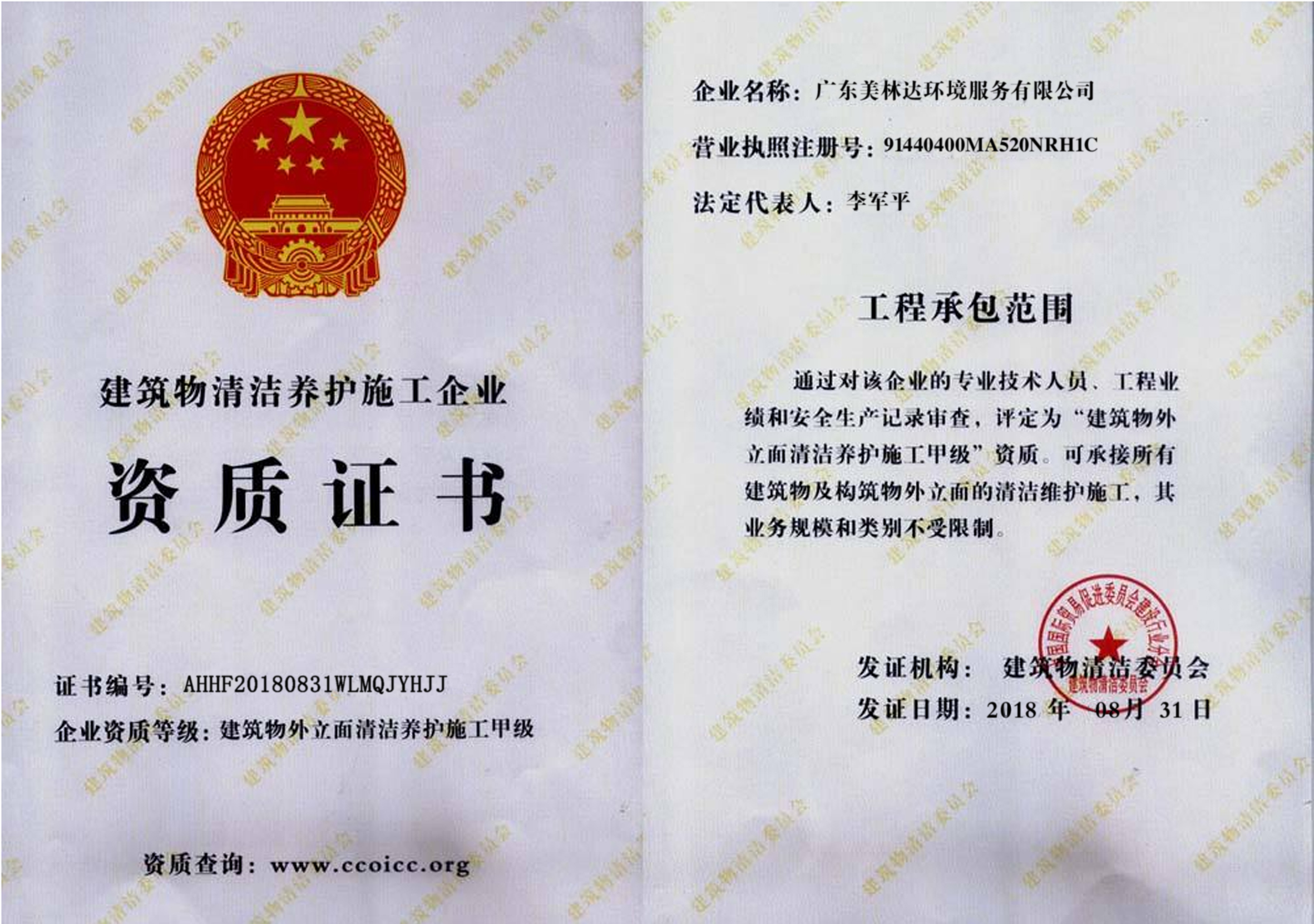 清潔保養(yǎng)施工資質(zhì)證書